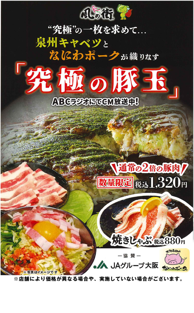 こちらの季節限定メニューは終了いたしました。 ご好評いただきありがとうございました。 2月1日〜2月末日まで、関西エリアの店舗(千林店・寝屋川店・放出店・京橋店・京橋飛騨店・玉造店・枚方店・天満橋店・四條畷店・交野店・大東店・古川橋店・八戸ノ里店・松原駅前店・東三国店・塚口店)にて、 大阪泉州キャベツとブランド豚なにわポークを使用した 「 究極の大阪豚玉 」をご提供中! お見逃し無く(-_☆)!